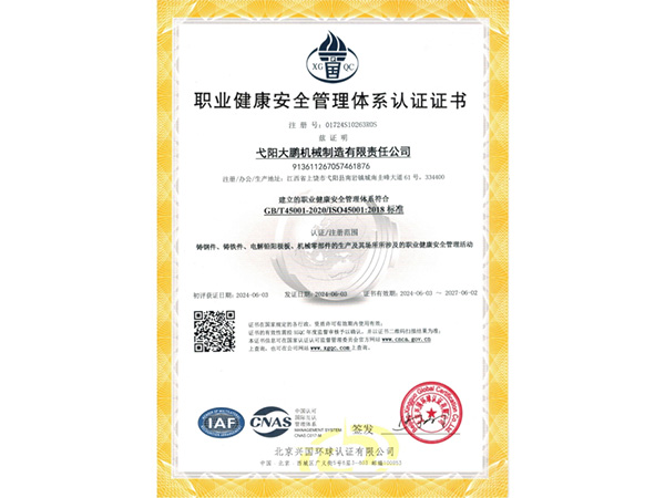 公司順利通過質(zhì)量管理體系認(rèn)證、環(huán)境體系認(rèn)證、職業(yè)健康安全管理體系認(rèn)證、環(huán)評(píng)。2015年5月獲國家工信委頒發(fā)的《鑄造企業(yè)準(zhǔn)入條件》;2019年做了安全現(xiàn)狀評(píng)價(jià);2020年取得了排污許可證。